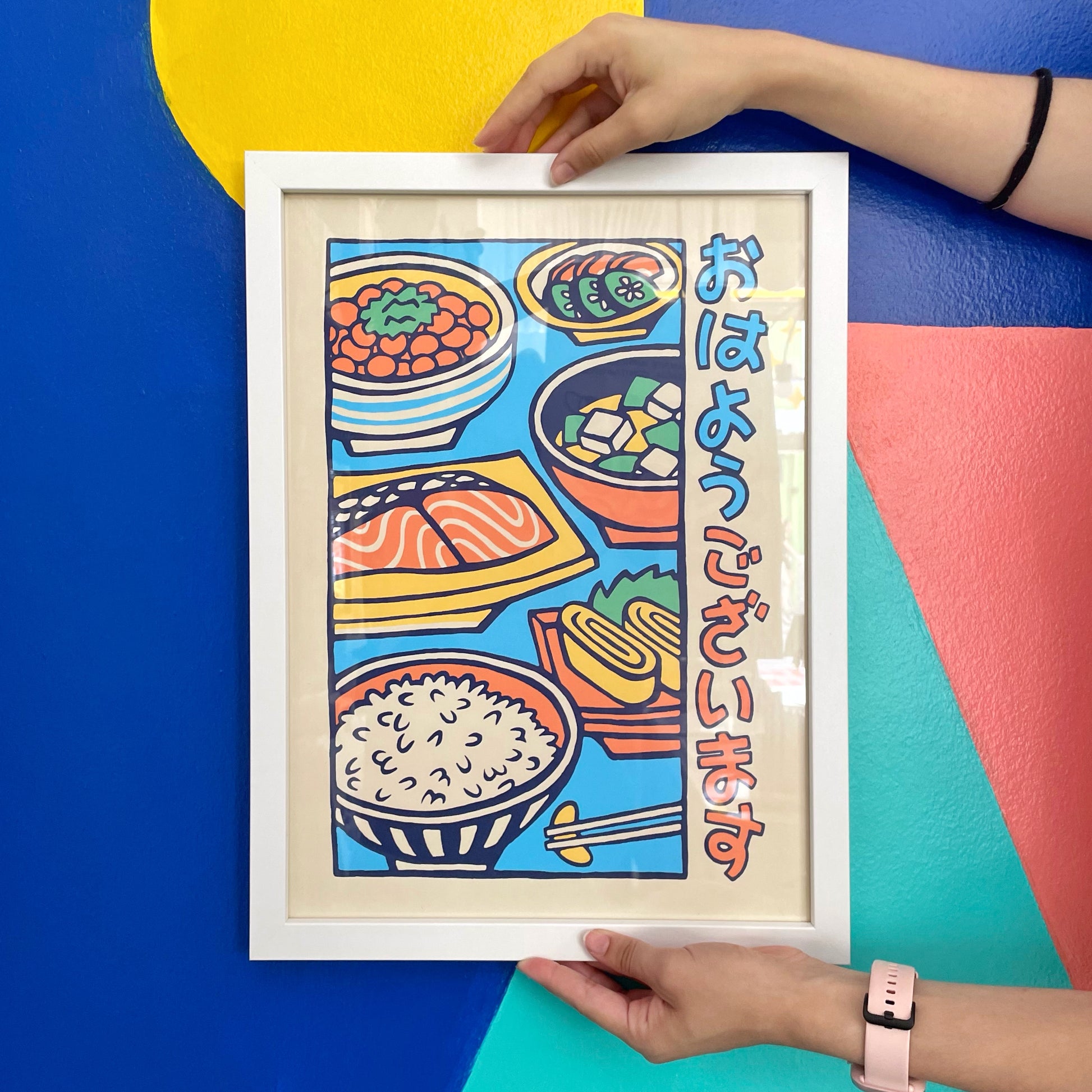 This illustration is part of the "Umami" collection by Yeaaah Studio. It shows a traditional Japanese breakfast consisting of many dishes (miso soup, fish, white rice, marinated vegetables, natto and omelet). The expression ohayou gozaimasuis the way the Japanese say "good morning" in the morning. The graphic style is inspired by commercial illustrations from the early 20th century.